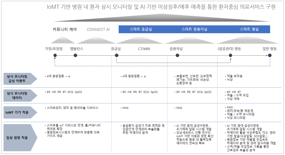 다양한 IoMT 기기가 적용될 수 있는 표준 환경 구축, 병원 내 환자의 주요 활력징후에 대한 Seamless한 모니터링 및 병원정보시스템과의 데이터 통합 및 AI 학습을 통해 환자별 신속/정확한 의료 의사결정을 지원하는 ‘IoMT 기반 표준 플랫폼’ 개발사업내용